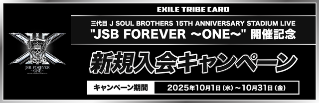 LDH's official credit card "EXILE TRIBE CARD" is holding a registration campaign for new card holders to celebrate the holding of "J SOUL BROTHERS III 15TH ANNIVERSARY STADIUM LIVE 'JSB FOREVER ~ONE~'"!